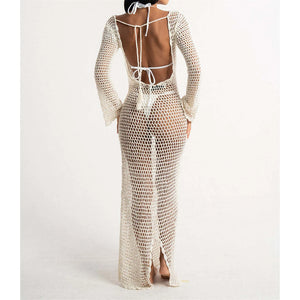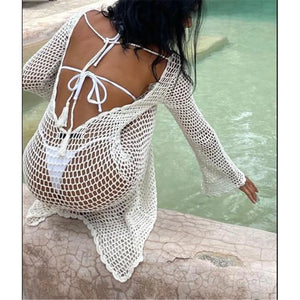 Elevate your beach style with this Hollow Out See Through Backless Crochet Tunic. Its sophisticated design effortlessly blends a see-through crochet pattern with a backless style, offering an alluring and breezy feel. Perfect for lounging by the shore, this cover up is an essential piece for your beachwear collection.
