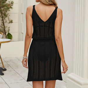 Step into beach sophistication with this V neck hollow out crochet knitted tunic. Designed as a mini beach dress, this cover-up combines elegance with a breezy style, perfect for layering over your swimwear. The intricate crochet pattern and hollow out details make it a chic addition to your summer wardrobe.