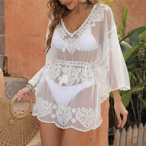 Erleben Sie die Faszination unseres bestickten V-Ausschnitts für den Strand. Diese ätherische Tunika mit tiefem V-Ausschnitt betont Ihren strandtauglichen Look, während zarte Stickereien einen raffinierten Touch verleihen. Die langen Ärmel bieten zusätzlichen Schutz vor den Sonnenstrahlen, während der durchsichtige Stoff einen Blick auf Ihren Badeanzug freigibt. Ideal für einen Tag am Wasser oder einen abendlichen Spaziergang am Strand - dieser Überwurf ist eine schicke Ergänzung Ihrer Bademodenkollektion.
