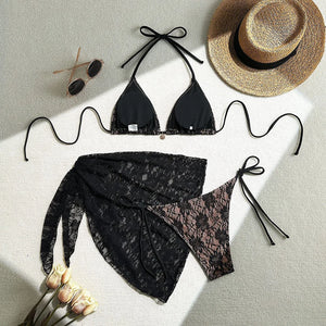Elevate your beach style with this three-piece bikini set featuring a mesh sarong. The lace halter top and high cut bikini bottoms offer a perfect balance of elegance and allure. With its airy mesh sarong, this set provides a fashionable and versatile look for any beach outing, seamlessly blending style with coverage.