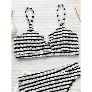 Make a bold statement with this black and white striped cut-out bikini set. The high-waist design adds a classic touch to the modern cut-out style, creating a chic and flattering silhouette. Ideal for beachside relaxation or poolside fun, this two-piece bikini offers both comfort and style.