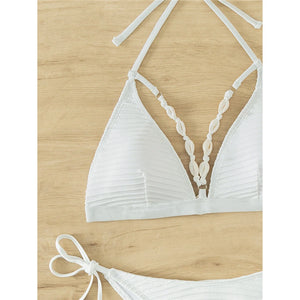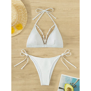 Dive into elegance with this Halter Strappy High Leg Cut Shell Bikini. This two-piece set features a chic halter top with delicate shell accents and high leg cut bottoms, creating a stylish and flattering look. Perfect for adding a touch of sophistication to your beach day adventures.
