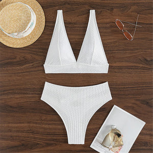 Gehen Sie selbstbewusst aus dem Haus mit unserem Cheeky Wrinkled V Neck High Waist Bikini Set in den Größen XS bis L. Dieser zweiteilige Badeanzug betont Ihre Kurven mit einem frechen Schnitt und einem schmeichelhaften Oberteil mit V-Ausschnitt, während die Hose mit hoher Taille sowohl Komfort als auch einen Hauch von Retro-Stil bietet.