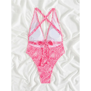 Dive into sophisticated style with this printed deep V-neck cross back one-piece swimsuit. The high-leg cut and unique print accentuate your silhouette, while the cross back design adds a touch of elegance. This monokini is perfect for making a fashionable statement at any beach or poolside gathering.
