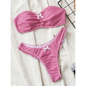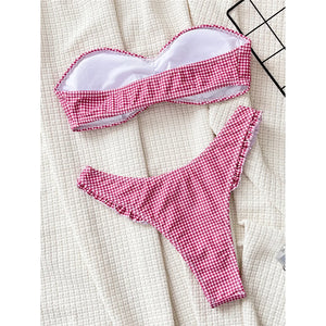 Embrace a classic look with this Plaid Bandeau High Leg Cut Brazilian Bikini. This two-piece set features a timeless plaid pattern and a flattering high leg cut, offering a chic yet comfortable style perfect for any beach day. The bandeau top enhances the silhouette, making it a stylish addition to your swimwear collection.