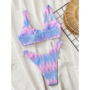 Embrace bold colors and texture with our Tie Dye Crinkled Brazilian Bikini Set. This two-piece swimwear combines a unique tie-dye pattern with a crinkled texture, designed to offer a flattering and eye-catching look for your beach or pool outings.