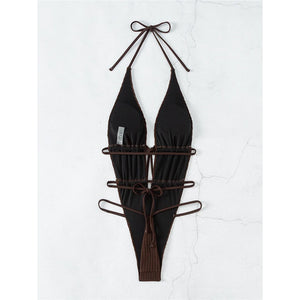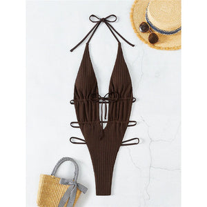 Embrace a daring and chic style with our Wrap Around Deep V Neck Halter Backless Swimsuit. This one-piece features a bold design with a deep v-neck and backless silhouette, perfect for turning heads at the beach or pool.