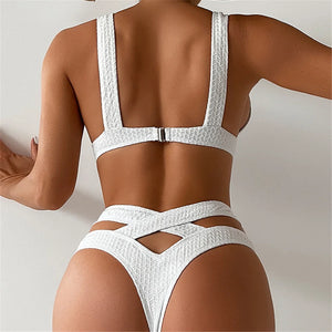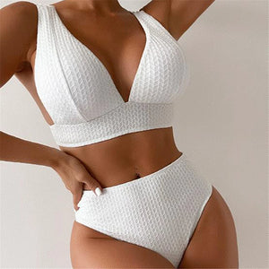 Sortez en toute confiance avec notre ensemble de bikini taille haute à col en V froissé, conçu pour les tailles XS à L. Ce maillot de bain deux pièces accentue vos courbes avec une coupe effrontée et un col en V flatteur, tandis que le bas à taille haute apporte à la fois confort et une touche de style d'inspiration rétro.