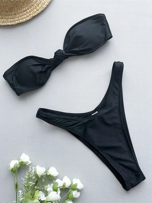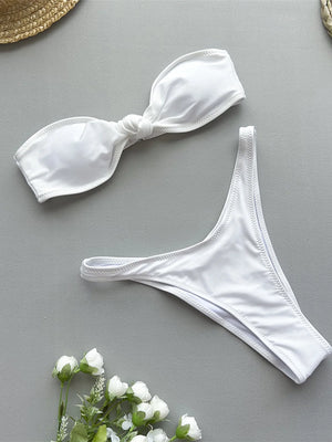 Dive into endless summer vibes with this chic bandeau knotted Brazilian bikini. This two-piece swimsuit combines sleek design with a trendy high cut, accentuating your curves and providing a bold, confident look. The knotted bandeau top adds a touch of playful sophistication, making it perfect for lounging by the pool or catching some sun on the beach. Enjoy the perfect blend of style and comfort with this must-have bikini set.