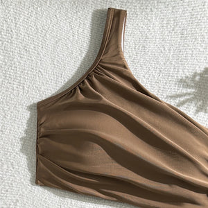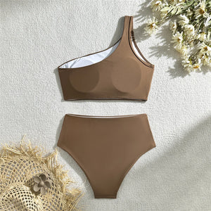 Embrace unique style with this wrinkled one-shoulder high waist bikini set. The distinctive design features a chic one-shoulder top and high-waist bottoms, creating a flattering and fashionable silhouette. Perfect for beach days or poolside lounging, this two-piece bikini blends modern elegance with comfort.
