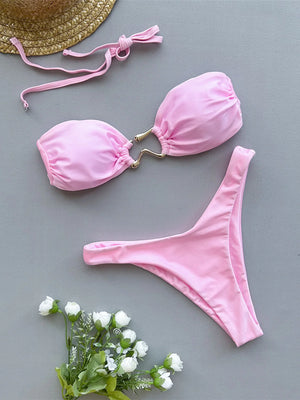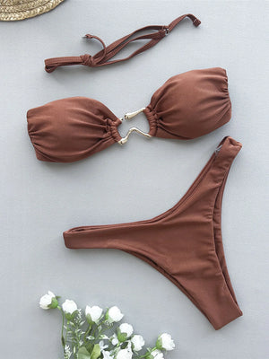 Shine with sophistication in our Metal Ring Bandeau High Leg Cut Bikini Set. This chic two-piece swimwear combines a sleek bandeau top with eye-catching metal ring accents and a high leg cut, perfect for making a stylish statement by the pool or beach.