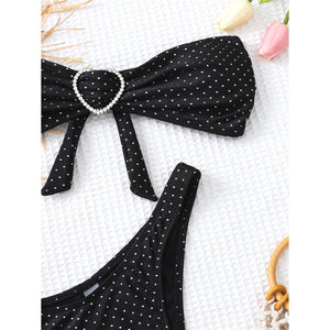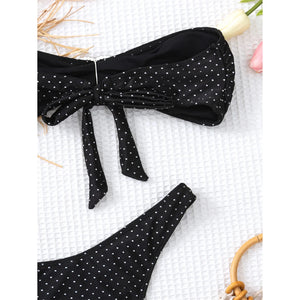 Embrace classic charm with this polka dots bandeau bikini set, complemented by a matching sarong. The playful polka dots add a fun and retro touch, while the bandeau top offers a sleek look. This three-piece set is perfect for transitioning from sunbathing to strolls along the shore, combining style with versatility.