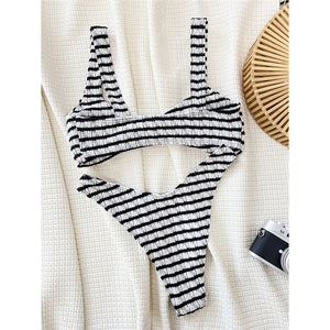 Fate le onde con il nostro set di bikini brasiliani a righe con taglio alto. Questo accattivante costume da bagno a due pezzi presenta un giocoso design a righe con un'esclusiva texture rugosa, che offre stile e comfort. Il taglio alto assicura una silhouette perfetta, rendendolo un must per la vostra collezione di costumi da bagno.