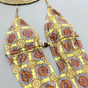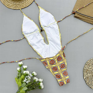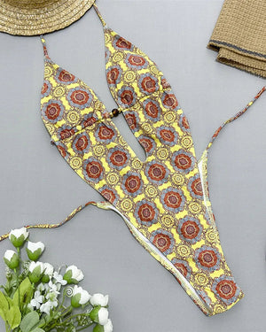 Make a statement with this Printed Deep V Neck Halter One Piece Swimsuit. This stylish monokini features a bold print and a high cut design, highlighting your curves while offering a comfortable fit. The deep V neck and backless style add a touch of allure, making it an ideal choice for beachside adventures.