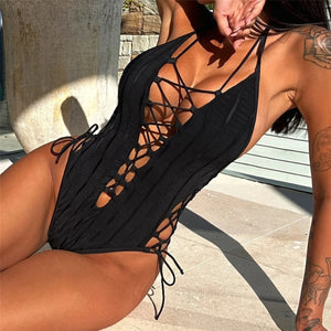 Step into the sun with our Wrinkled Lace Up Strappy Halter Monokini. This one-piece swimsuit exudes elegance with a textured, wrinkled design and high-cut leg to elongate your figure. The lace-up detailing and halter neck style add a touch of flirtatious charm to your beach day ensemble.