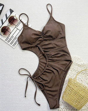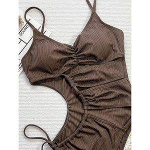 Discover a daring look with this asymmetric cut-out lace-up one piece swimsuit. Featuring a stylish blend of modern design elements, its wrinkled texture and high cut silhouette perfectly complement the unique lace-up details. This padded swimsuit combines comfort with boldness, ideal for making a splash with confidence.