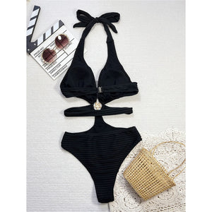 Flaunt a sleek and sophisticated look with this V neck cut-out halter ribbed monokini. Featuring a stylish ribbed texture and high cut design, this one piece swimsuit offers both elegance and comfort. The padded top provides support, making it an ideal choice for a confident and fashionable day at the beach or poolside.