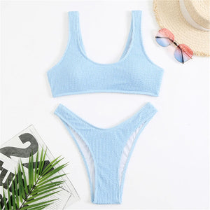 Dive into vibrant style with this high cut bikini set available in eight stunning colors. The unique wrinkled crinkled texture provides a modern twist and flattering fit, making it a perfect choice for those seeking both comfort and fashion. Elevate your swimwear collection with this versatile and chic two-piece bikini.